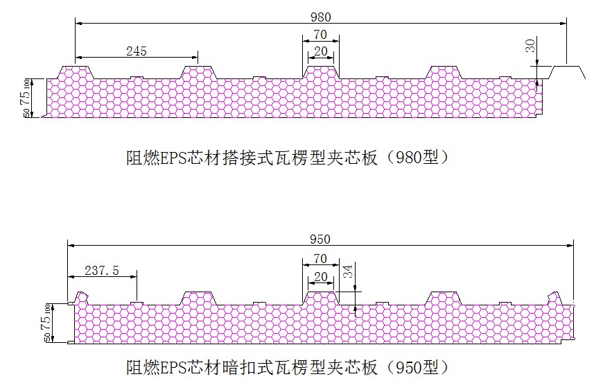 屋面頂板均采用7.5公分980型瓦愣夾芯板。有效寬度是980mm,上海藍(lán)下白灰,兩面鋼板厚度0.426/0.326mm。